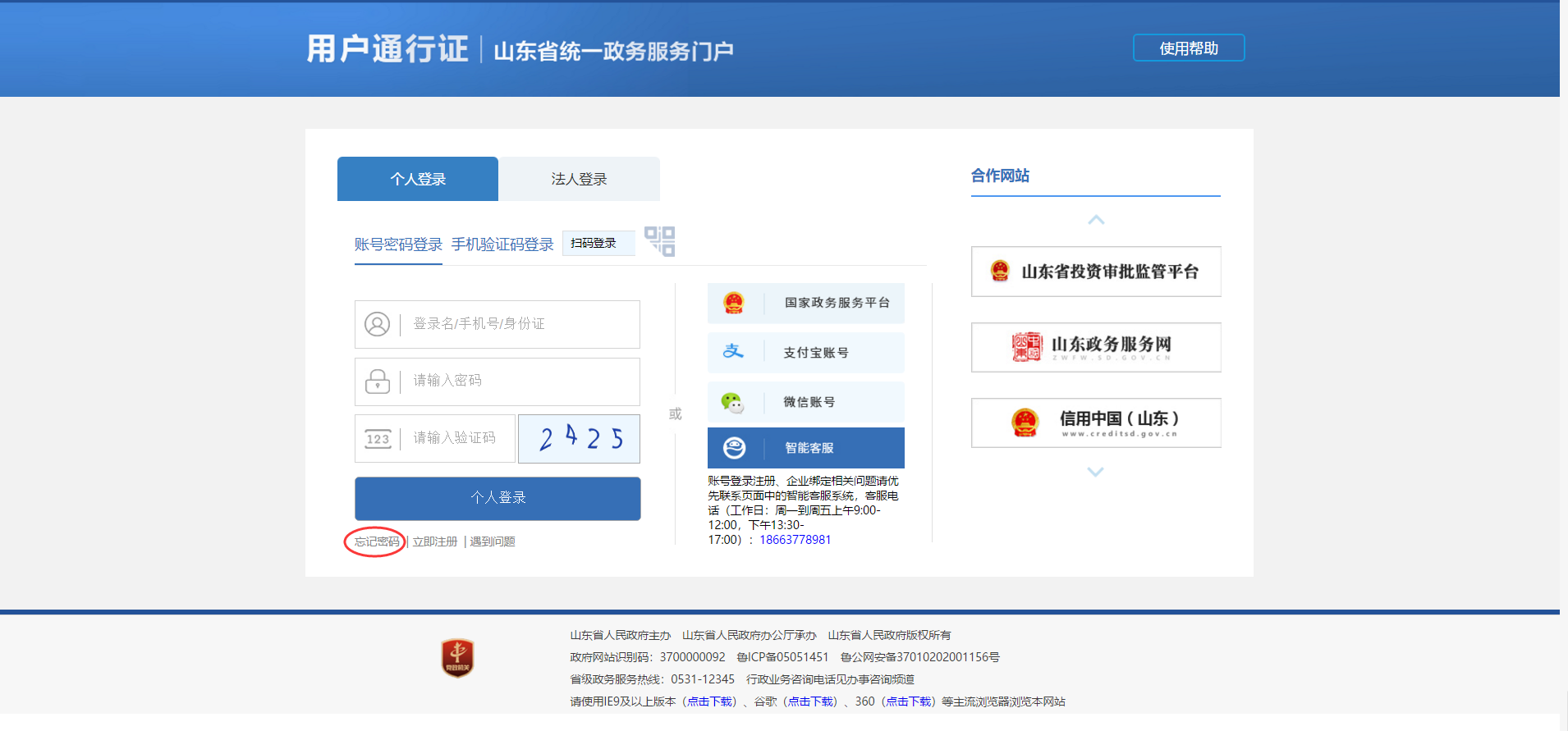 1. 法人用户在政务服务网注册过法人账号,忘记登录密码,可在浏览器中输入山东政务服务网网址http://rzzwfw.sd.gov.cn/rz/public/index,打开网站后点击页面右上角的“登录”按钮,在账号登录页面选择“法人登录”,然后选择“忘记密码”进行找回。注意:法人找回密码只能找回法人账号的密码,管理员和经办人的密码需要通过登录法人账号,在法人空间中修改管理员和经办人密码。