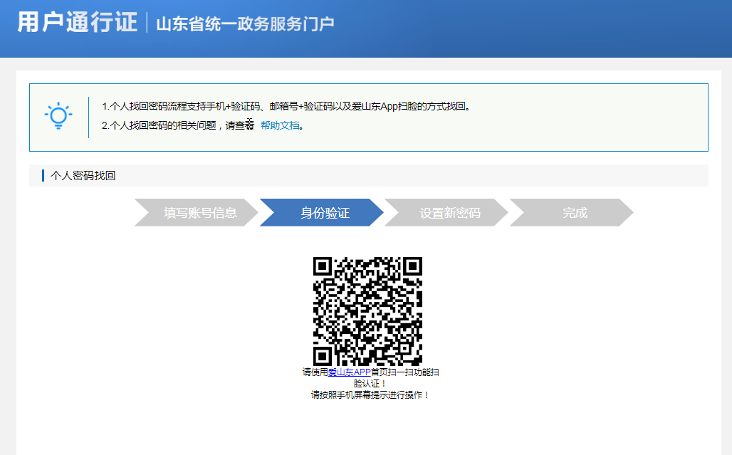 3. 在验证身份环节涉及到三种验证方式:手机号+验证码方式、邮箱+验证码方式、爱山东APP扫脸认证。