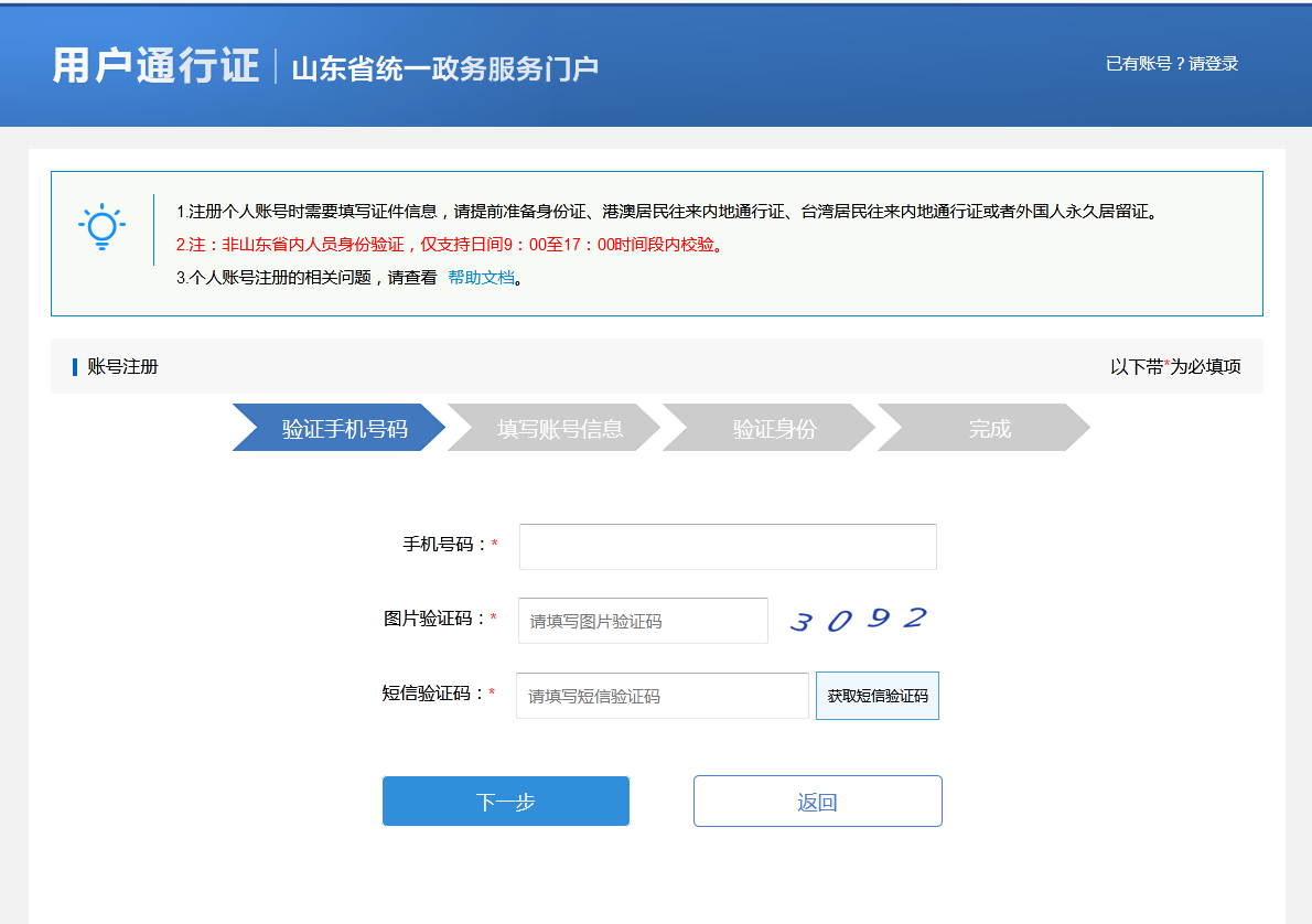 3.根据页面提示填写相应的手机号码、图片验证码、短信验证码,填写无误后点击“下一步”,然后填写用户名、密码、电子邮箱。(注意:用户名设置规则长度为4~30个字符,支持字母和数字组合;密码设置规则长度为6~18位,建议两种或以上的字母、数字、符号组合)。
