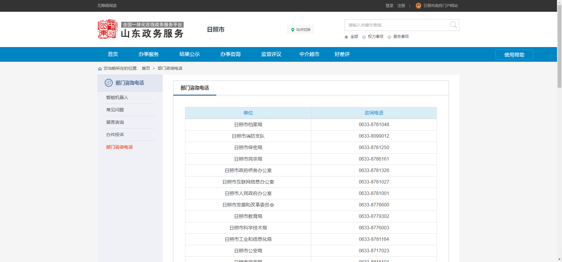 2.业务办理问题请联系相关业务部门。在“办事咨询”模块,点击“部门咨询电话”,找到部门电话,致电咨询。